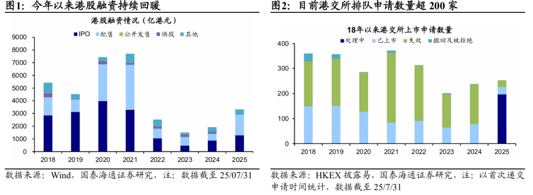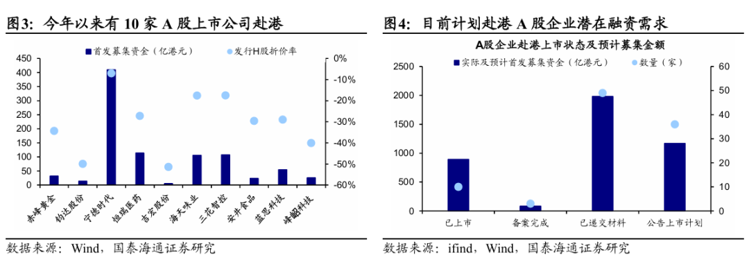 融資:綜合IPO和再融資視角,年內后續融資規模或近3000億港元。今年以來,受益於港股融資環境回暖及政策支持,港股融資規模明顯提升。截至7月末,今年港股整體融資規模達3318.8億港元,其中IPO融資規模達1278.8億港元,融資額躍居全球首位。值得關注的是,去年A股龍頭企業赴港上市流程優化,A股企業加速登陸港股,年初以來共有包括寧德時代、恆瑞醫藥等10家A股公司赴港上市,合計首發募集資金為893億港元,佔港股整體IPO的七成左右。