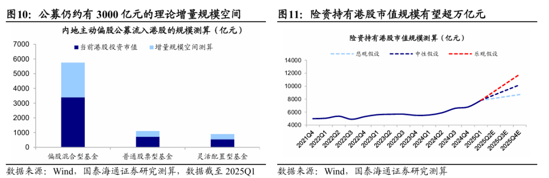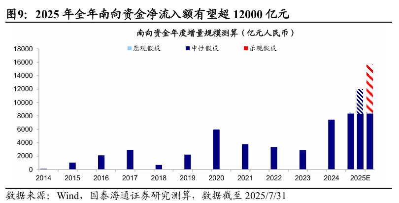 全年南向增量供給望超1.2萬億,下半年港股是增量資金市。該行認為,年內后續港股資金流出項整體壓力或相對可控,全年南向淨流入規模有望超過1.2萬億元,為港股資金蓄水池提供源源活水。今年以來南向資金持續流入港股,截至25/8/8,南向已累計淨流入超8300億元,超越去年全年流入總額,往后看,以內資機構為代表的南向資金仍有較為可觀的增配空間:公募方面,若按港股基金合同規定的港股投資比例上限測算,預計全年公募基金總規模有望達3000-4500億元;險資方面,受益於保費規模穩步增長,預計全年險資實際增量有望達2500-4000億元左右。