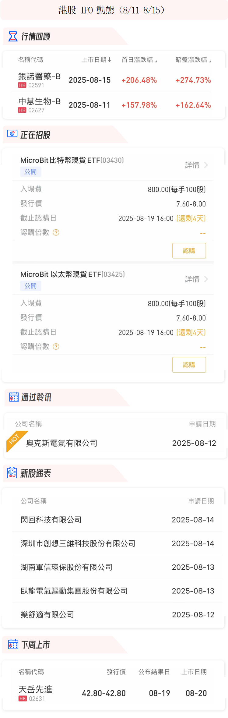MicroBit助力港股投資者全方位把握虛擬資產投資浪潮,旗下比特幣現貨ETF及以太幣現貨ETF正式開啟認購,入場門檻每手800港元,預計將於8月21日正式上市。