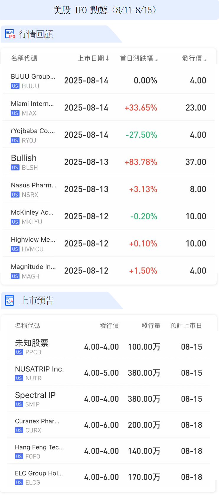 美股方面,本周共有11只新股上市。「幣圈新貴」Bullish $BLSH 首日漲幅達到83.78%,該公司為知名加密貨幣交易平臺,業務主要面向機構投資者。另外,美國交易所運營商MIAX母公司邁阿密國際控股 $MIAX 也於首日實現33.65%的亮眼漲幅。