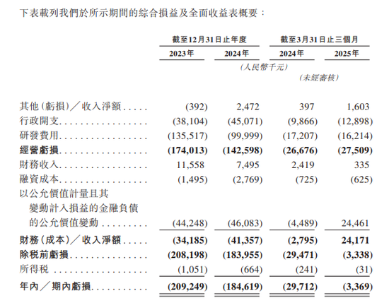 招股書顯示,在過去的2023年、2024年和2025年前三個月,應世生物的營業收入均為零,相應的研發費用分別為人民幣1.36億、1.00億和 0.16億元,相應的淨虧損分別為人民幣2.09億、1.85億和336.9萬元。