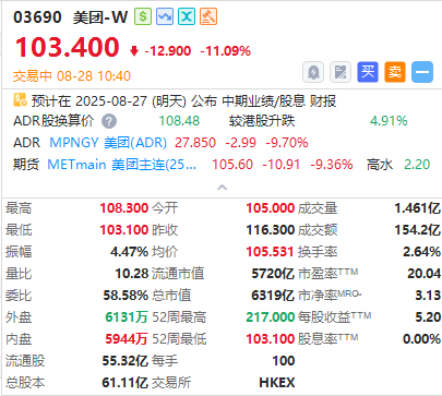 8月28日,截至發稿,美團-W暴跌超11%,成交額超150億港元。