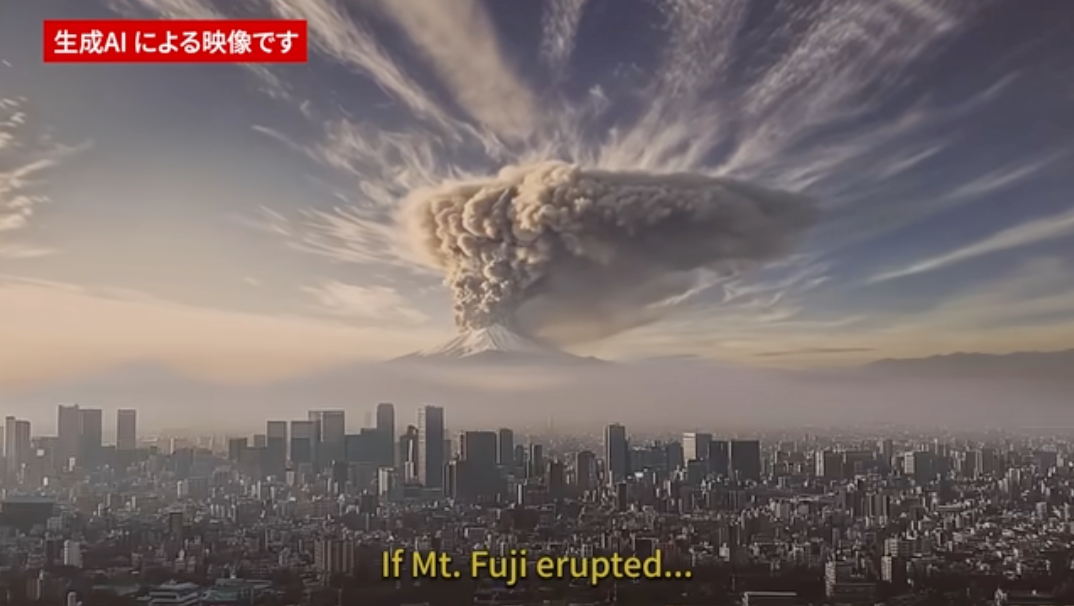 這一切都來自日本政府發佈的一段AI生成視頻,用來警示東京兩千萬居民:如果這座壯麗的火山真的噴發,他們將會面對怎樣的景象。
