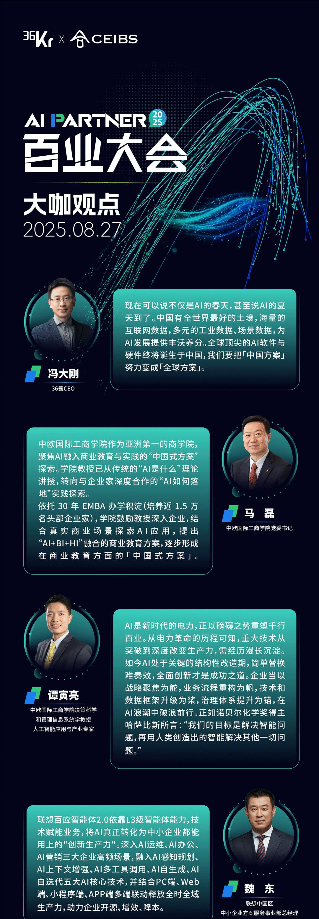 8月27日,由36氪與中歐國際工商學院聯合主辦的2025 AI Partner百業大會在北京中關村軟件園成功舉辦。本屆大會以「中國式方案」為主題,分為「中國式方案」和「誰來定義下一個人工智能時代」兩大核心議題,匯聚全球AI領域的專家學者、企業領袖、機構投行與創新先鋒,共同探索中國式方案的創新模式。