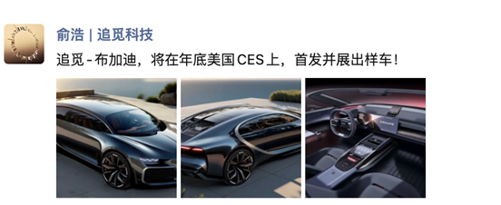 9月10日,追覓科技創始人兼CEO俞浩在朋友圈發了三張汽車的渲染圖。配文表示:追覓-布加迪,將在美國CES上,首發並展出樣車。也就是説,這個8月才正式官宣的產品,將在明年1月的CES亮相。