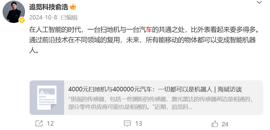 去年10月,俞浩轉發了一篇探討掃地機器人與汽車技術異同的媒體報道,並説道「在人工智能時代,一臺掃地機器人與一臺汽車的共通之處,比外表看起來要多得多。」
