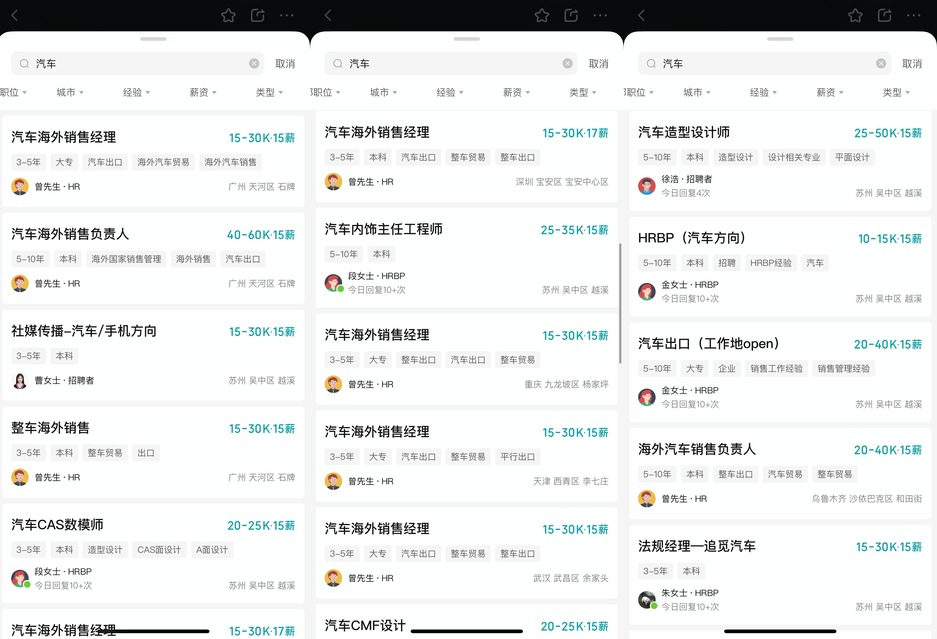 儘管汽車業務在國內如何推進仍在迷霧中,但追覓的相關崗位已經在不斷開放。在BOSS直聘上以「汽車」為崗位關鍵詞搜索,會發現不少在招崗位,且招聘者當日活躍。崗位包括汽車海外銷售經理、汽車造型設計師、汽車內飾主任工程師、HRBP(汽車方向)、社媒傳播(汽車/手機方向)等,整體月薪從1.5萬元起跳,最高月薪甚至能達到6萬元,工作地點遍佈國內多地。