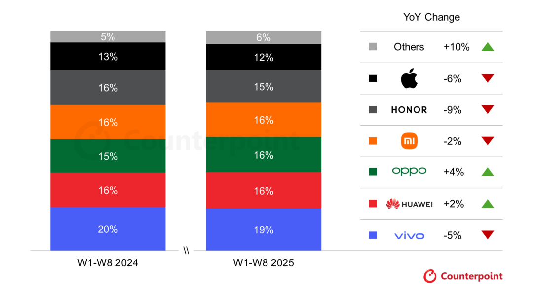 智通財經APP獲悉,Counterpoint數據顯示,2025年Q3前八周,受到vivo和榮耀銷量大幅下滑的影響,中國智能手機銷量同比下降2%。Vivo的Y300、S30和X200s系列在中端市場表現強勁,但由於促銷活動和國家補貼政策加劇了中高端市場的競爭,消費者購買的更多是中高端產品,利好OPPO和華為等公司。Counterpoint預計,2025年Q3中國智能手機市場將小幅下跌,而全年表現大體持平。