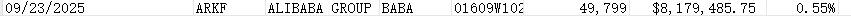 ARK Invest官網顯示,該公司旗下方舟金融科技創新ETF(ARKF)和方舟下一代互聯網ETF(ARKW)共買入了99090股阿里巴巴股票,以阿里巴巴股價收盤價為164.25美元計算,這些交易的總價值約為1630萬美元。