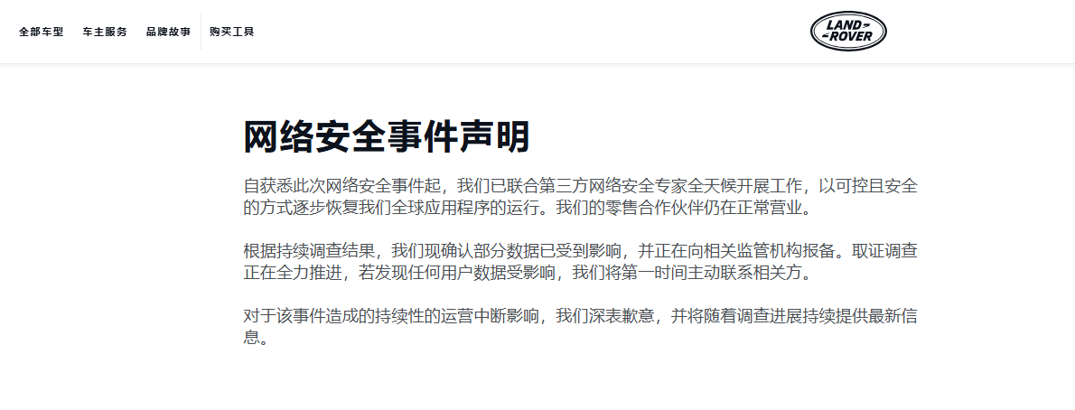 捷豹路虎發佈聲明稱,自獲悉此次網絡安全事件起,我們已聯合第三方網絡安全專家全天候開展工作,以可控且安全的方式逐步恢復我們全球應用程序的運行。我們的零售合作伙伴仍在正常營業。根據持續調查結果,我們現確認部分數據已受到影響,並正在向相關監管機構報備。取證調查正在全力推進,若發現任何用戶數據受影響,我們將第一時間主動聯繫相關方。