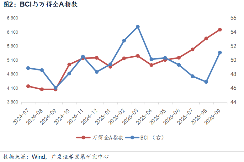據萬得數據(下同),長江商學院BCI指數自2024年9月46.0的低點震盪修復。2025年1-3月BCI分別為49.4、52.8、54.8;4-5月分別為50.1、50.3;6-8月則分別為49.3、47.7、46.9,9月較明顯上行至51.1。