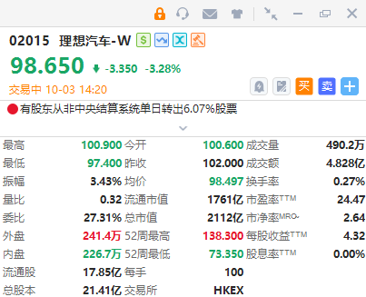 理想汽車-W(02015)跌超3%,截至發稿,跌3.28%,報98.65港元,成交額4.828億港元。