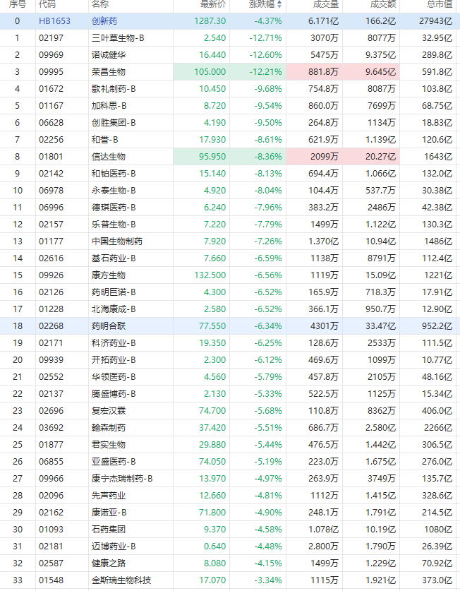 創新葯概念今日普遍重挫,截至發稿,三葉草生物-B、榮昌生物、諾誠健華均跌超12%,信達生物跌超8%,中國生物製藥跌超7%,康方生物、藥明合聯跌超6%,君實生物跌超5%。