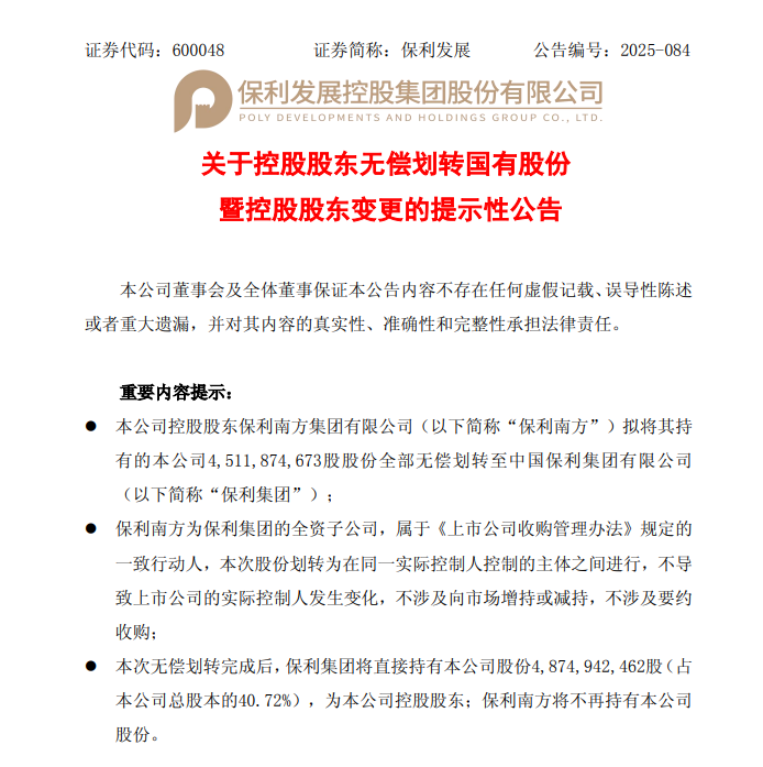 10月9日,保利發展(600048.SH)公告稱,公司收到保利集團《關於國有股份無償劃轉的告知函》,保利南方擬將其持有的公司45.12億股股份無償劃轉至保利集團。本次無償劃轉后,保利集團將直接持有公司48.75億股(佔總股本的40.72%),成為公司控股股東,而保利南方將不再持有公司股份。本次無償劃轉屬於國有資產內部劃轉,不涉及向市場增持或減持,不涉及要約收購,實際控制人仍為保利集團。