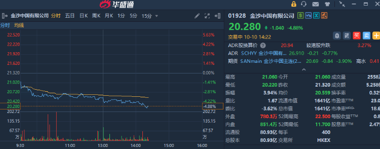 華盛資訊10月10日訊,博彩股午后跌幅擴大,截至發稿,金沙中國跌近5%,新濠國際發展、澳博控股、銀河娛樂跌超4%,美高梅中國跌超2%。