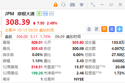 摩根大通漲近2.5%,宣佈啟動一項總額達1.5萬億美元的計劃。