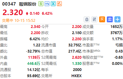 華盛資訊10月15日訊,港股鋼鐵行業股走高,截至發稿,中國罕王漲逾9%,鞍鋼股份、馬鞍山鋼鐵股份及天工國際漲超6%。