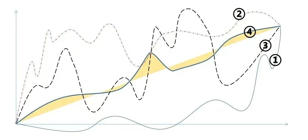 這個問題類似下面的圖,我在以前的多篇文章中引用過,幾支股票的收益率完全相同,但在那些波動更小的股票上,普通投資者更容易賺到錢。