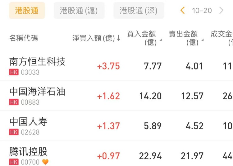 北水淨買入最多的個股是南方恆生科技、中海油、中國人壽,分別淨買入3.75、1.62、1.37億港元。