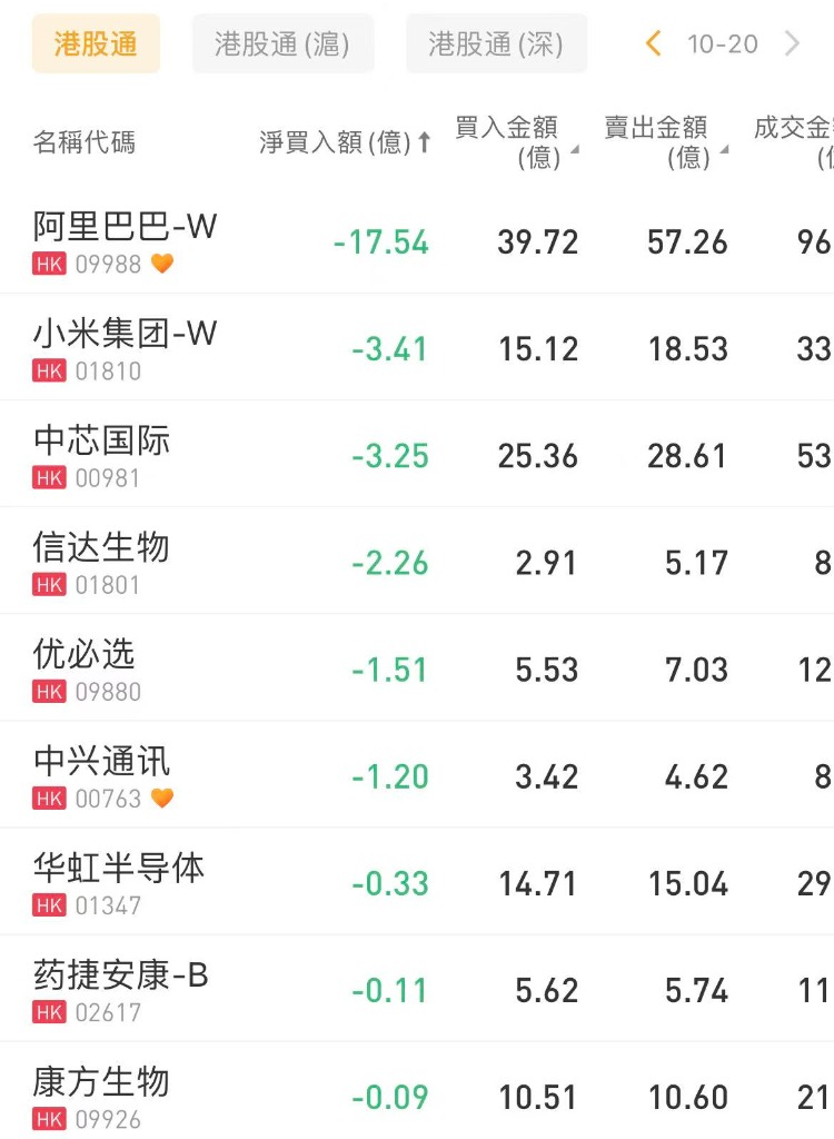北水淨賣出最多的個股是阿里巴巴-W、小米集團-W、中芯國際,分別淨賣出17.54、3.41、3.25億港元。