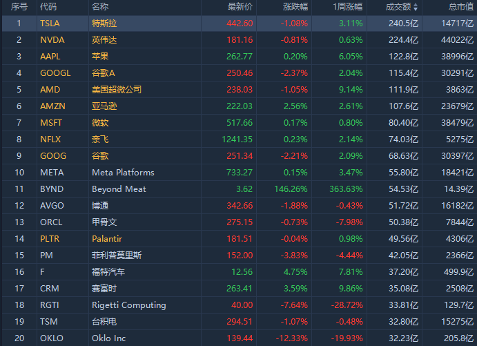 第16名福特汽車公司收高4.75%,成交37.20億美元。