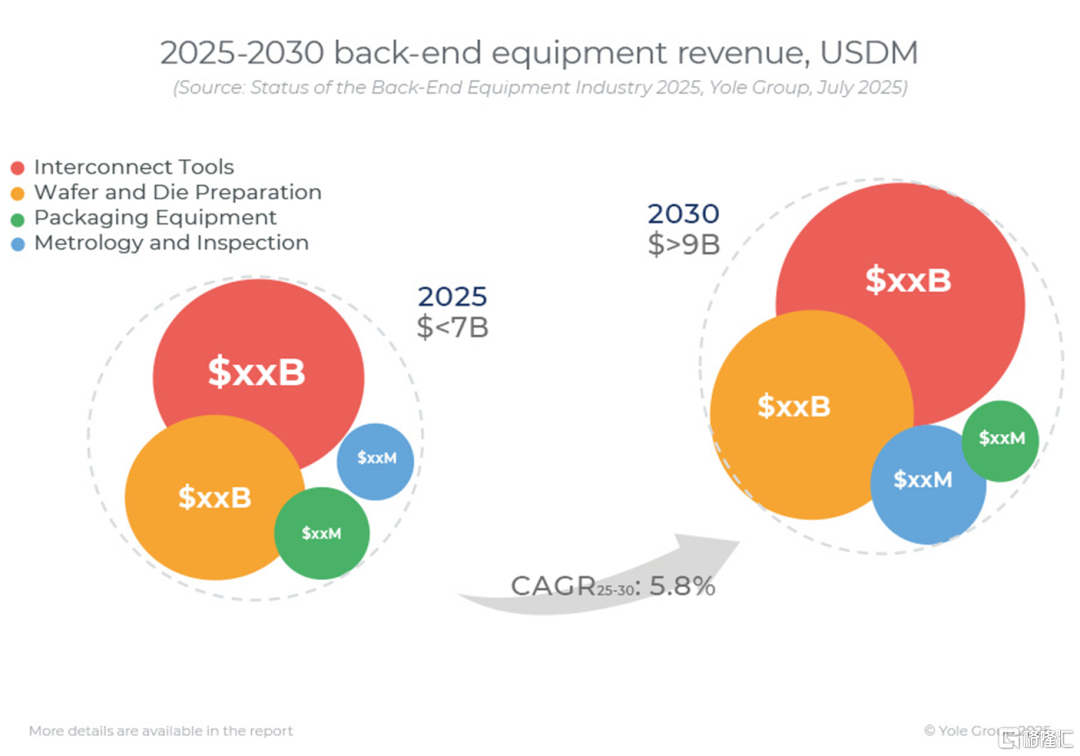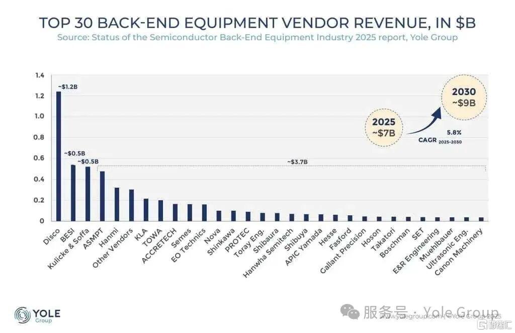 先進封裝市場的火熱也點燃了先進封測設備的發展浪潮。Yole Group 在報告中指出,2025 年后端設備總收入約70 億美元,預計到 2030 年將超過90億美元,年複合增長率接近 6%。