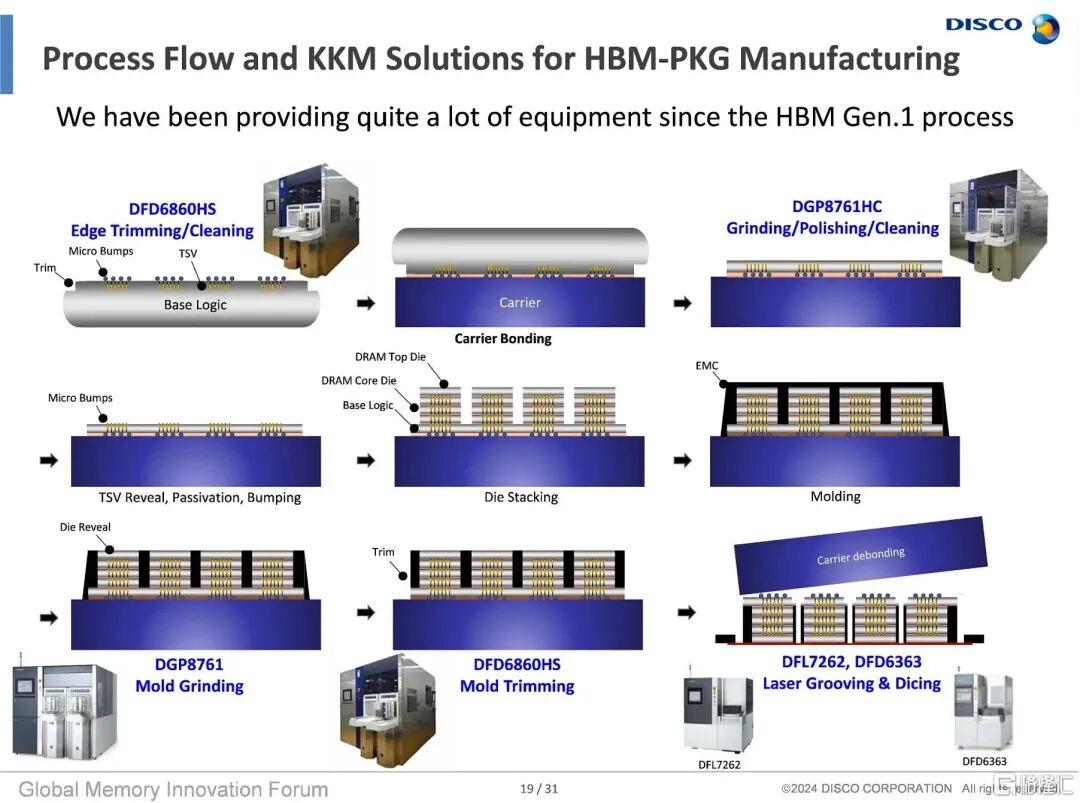 以HBM為例,在HBM技術中,TSV(硅通孔)工藝是核心,通過三維堆疊芯片來提升連接效率。DISCO為TSV提供了全面的技術支持,包括晶圓切割、研磨和拋光等關鍵工藝,憑藉其先進的DBG(切割+研磨)技術和SDBG技術,能夠成功解決在裸片製造過程中高精度和高效能的要求,確保芯片在堆疊過程中能夠保持高精度和高效性,實現HBM等芯片的批量生產。