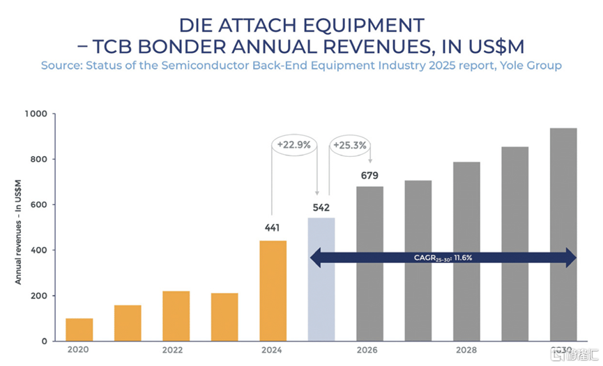 Yole Group指出,熱壓鍵合(TCB)市場將在2030年達到9.36億美元,將實現11.6%的年複合增長率,主要由內存與AI平臺的集成需求推動。