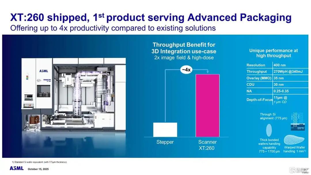 上文提到,ASML在最新財報中拋出的TWINSCAN XT:260光刻機,作為其首款面向先進封裝的量產設備,不僅填補了高端封裝光刻領域的技術空白,更重構了行業對封裝環節精度與效率的認知。