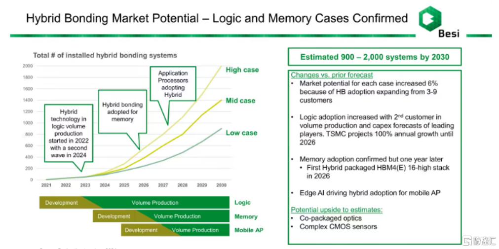 隨着先進製程逼近物理極限,芯片製造商正轉向異構集成與3D封裝技術以提升性能。混合鍵合憑藉其高密度互連與低功耗優勢,被視為替代傳統微凸點技術的關鍵方案。這將直接推動Besi在邏輯與內存應用領域的先進封裝解決方案需求增長。