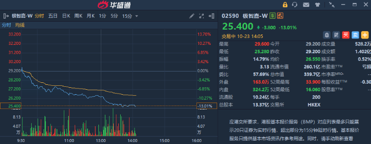 華盛資訊10月23日訊,港股機器人概念股集體下跌,其中極智嘉午后跌幅擴大至超13%,三花智控、速騰聚創、越疆跌超4%。