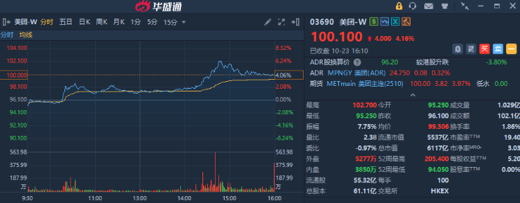 10月23日消息,港股三大指數低開高走。截至收盤,恆生指數漲0.72%,報25967.98點,恆生科技指數漲0.48%,國企指數漲0.83%。盤面上,科網股漲多跌少,美團漲超4%,阿里巴巴、騰訊、京東、百度漲超1%,嗶哩嗶哩跌超1%;石油股漲幅居前,延長石油國際漲超6%;內銀股活躍,郵儲銀行漲超4%;半導體板塊跌幅居前,華虹半導體跌超4%;新消費概念普跌,泡泡瑪特跌超9%。