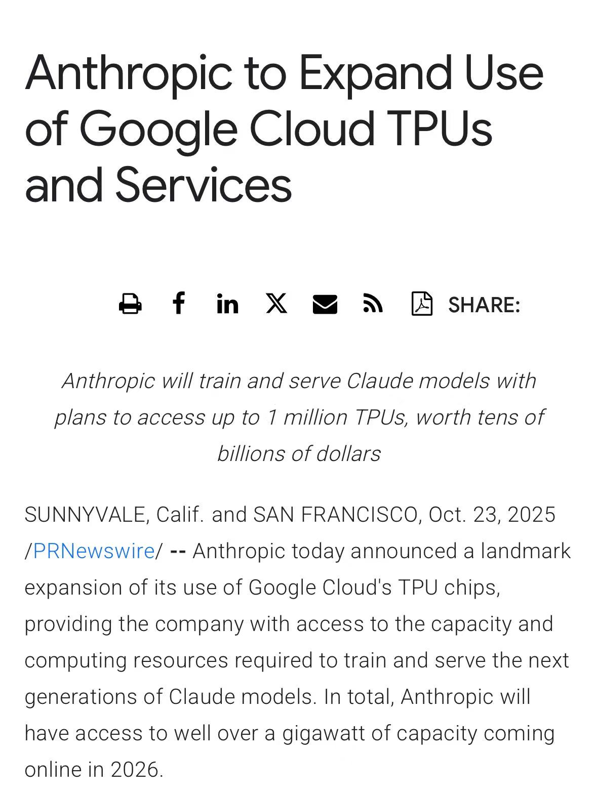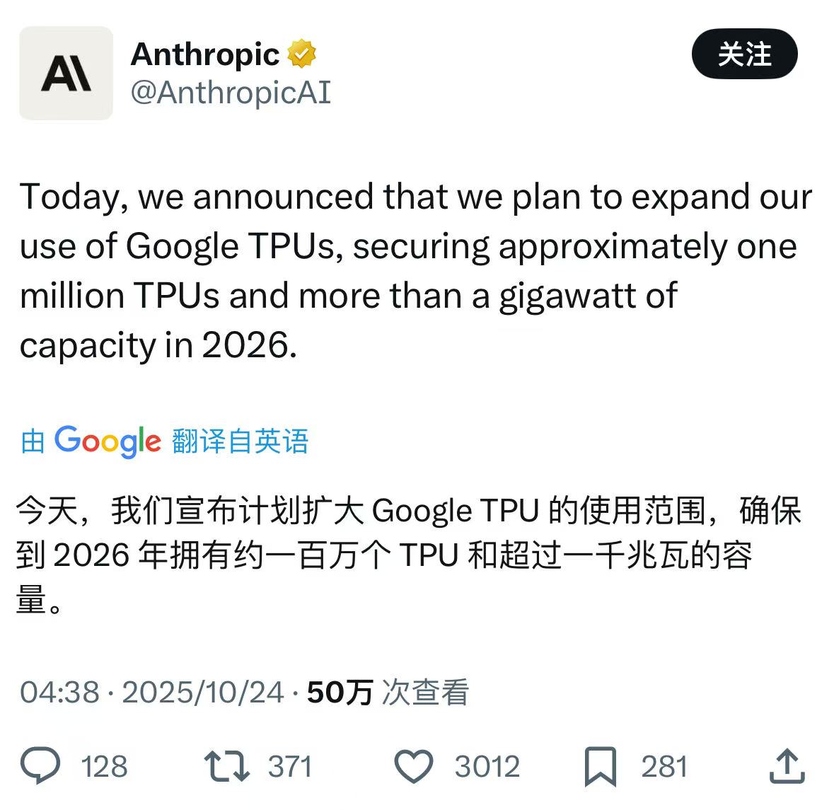 10月24日,人工智能公司 Anthropic 在社交平臺 X 上官宣,谷歌將向 Anthropic 供應多達100萬塊專用AI芯片TPU(Tensor Processing Units,TPUs)以及附加的谷歌雲服務。
