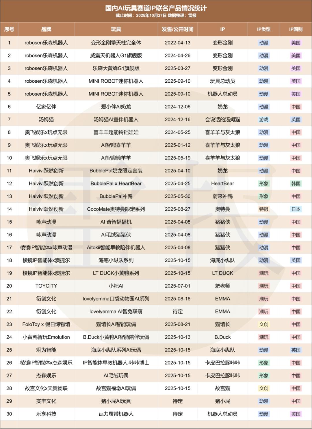 尤其值得注意的是,AI玩具行業當前已進入與IP深度融合的全新發展階段,這一趨勢在今年表現得尤為明顯。據雷報不完全統計,截至當前,市場上已有至少30款IP聯動型AI玩具上線或官宣,其中25款來自2025年,佔比超83%,且IP類型覆蓋動漫、潮玩、形象、文創、特攝等多元領域。在技術同質化尚未打破的行業初期,「卷IP」已成為品牌快速建立差異化認知、降低用户教育成本、搶佔心智的核心競爭策略之一。