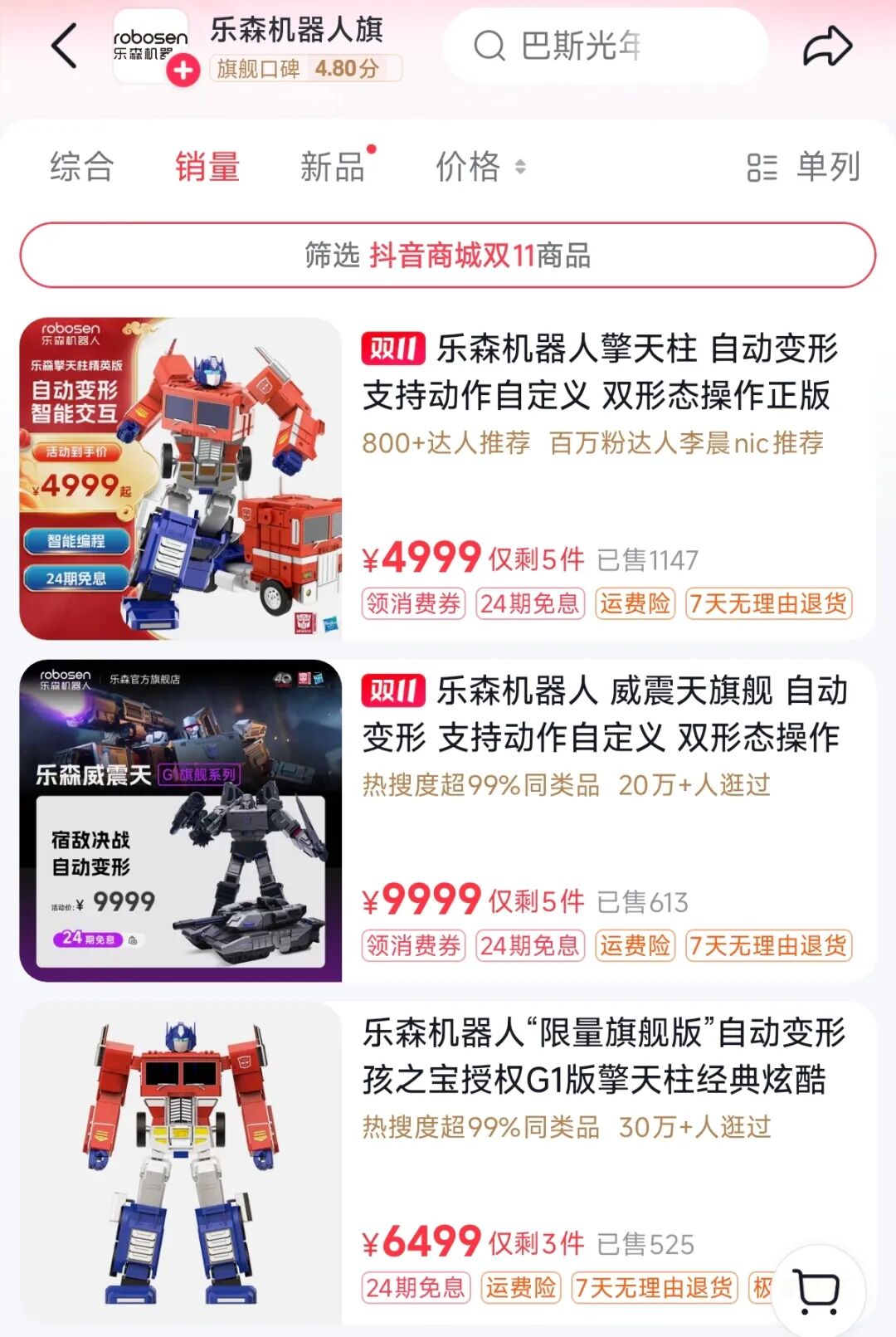 圍繞機器人+IP+AI的定位,Robosen通過多年在電動關節、驅動與控制系統、芯片、自適應運動算法、變形結構設計等研發積累,自主研發了「高精密智能人工關節」,形成核心競爭力。在國內電商平臺,其代表產品變形金剛擎天柱完全體,售價高達4999元,但仍在三大平臺實現2347+的銷量,單品銷售額超1170萬元。威震天機器人G1旗艦版的售價更高達9999元,也同樣實現了超800台的銷量,即銷售額超800萬元。