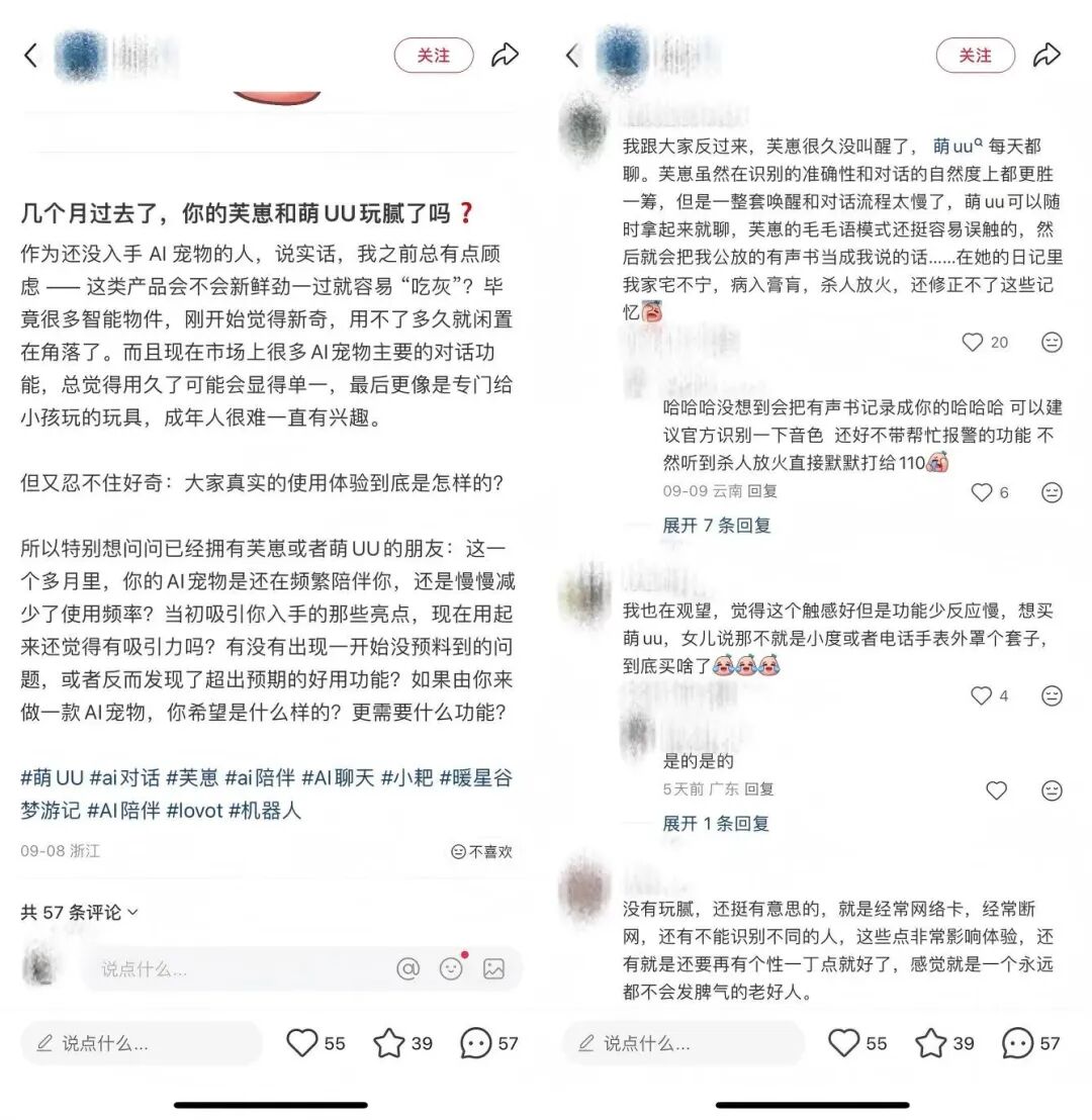 從小紅書的用户評價來看,吐槽內容主要集中於「對話反應慢」、「回答問題機械」、「功能單一」、「設計低齡化」、「玩幾天就膩了」等問題,其背后指向的其實是產品底層技術支撐不足和品質硬傷。與此同時,對於產品收費模式不合理、網絡不穩定、售后服務不周等商業與服務問題的吐槽也同樣較多,並進一步放大了用户整體的不滿情緒。