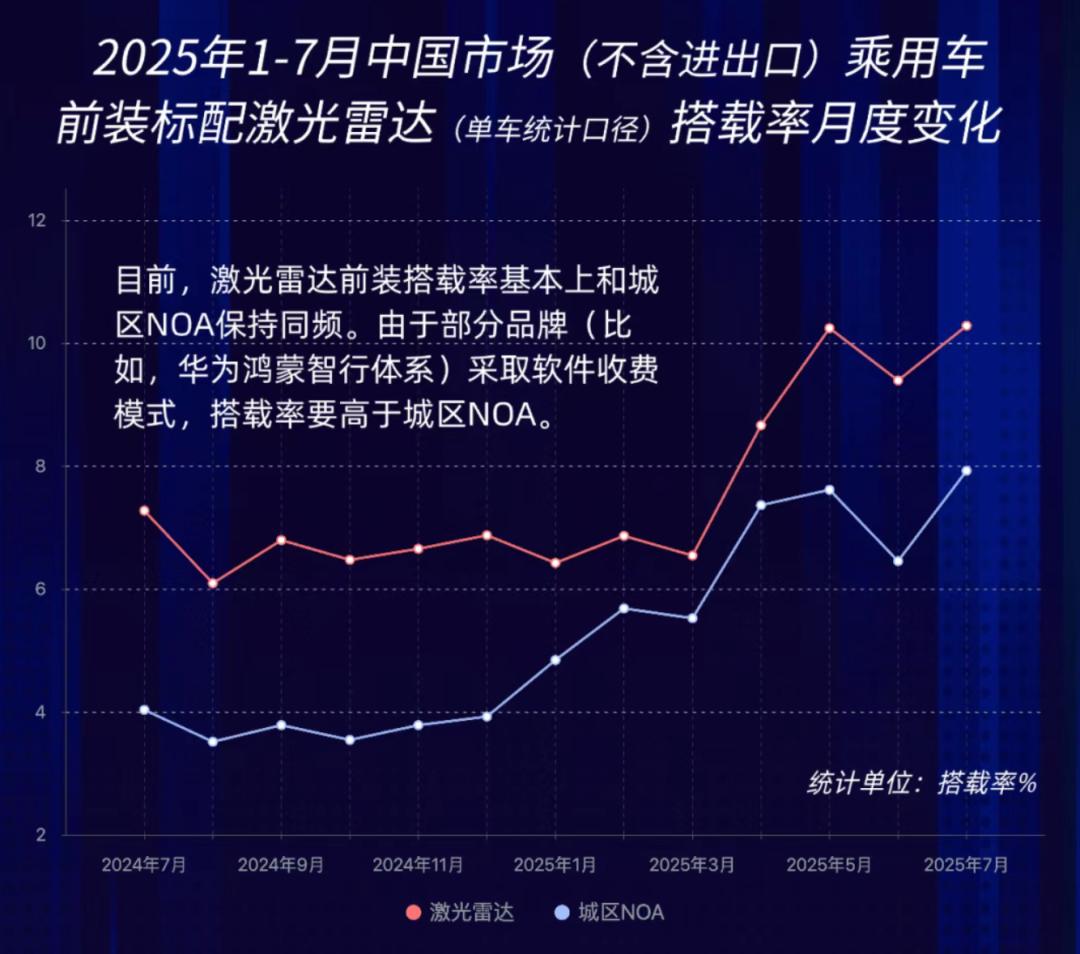 據高工智能汽車數據顯示,2025 年 1–7 月,中國市場(不含進出口)標配激光雷達的新車累計交付 104.84 萬輛,同比增長 69.73%。其中,20–30 萬元區間車型的標配率一度接近 30%。