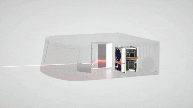 它的工作原理講起來並不複雜,搭載激光發射與接收模塊的整個光機結構以 360° 持續不斷的旋轉,完成對周圍環境的全景掃描。