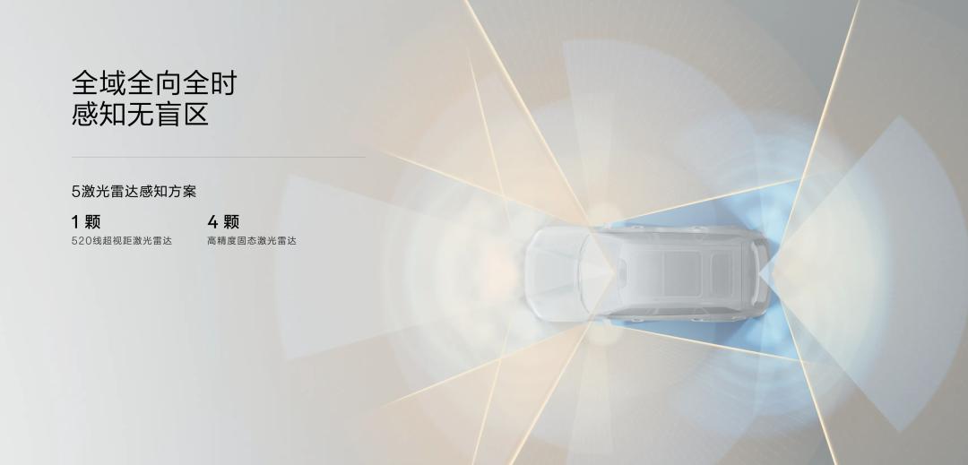 更有部分車型爲了提升智駕能力,不再滿足於「單雷達」方案。比亞迪仰望 U7 和 U8L 為 3 激光雷達方案,尊界 S800、享界 S9T、問界 M9 搭載了 4 顆,近期發佈的極氪 9X 更是採用了 1 顆 520 線長距雷達 + 4 顆高精度固態雷達的配置,實現了 360° 激光雷達全覆蓋。
