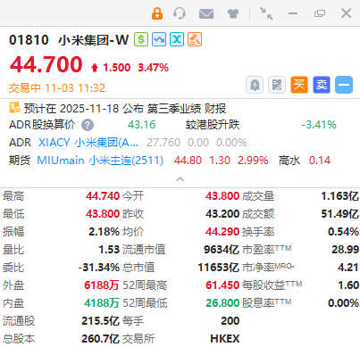 小米集團-W(01810)漲超3%,截至發稿,漲3.47%,報44.7港元,成交額51.49億港元。