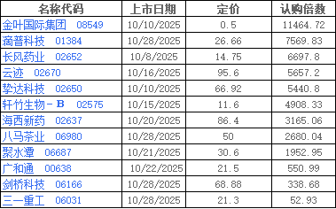 金吾財訊 | 港股「打新」市場的賺錢效應持續升溫。10月新股IPO數量繼續保持高位,認購情緒高漲,金葉國際集團認購倍數超萬倍,同時,多隻新股上市首日表現亮眼,市場交投活躍度顯著提升,為香港資本市場注入新活力。