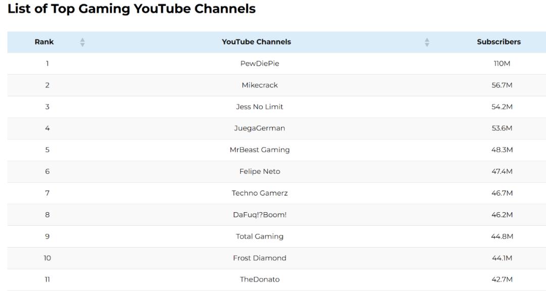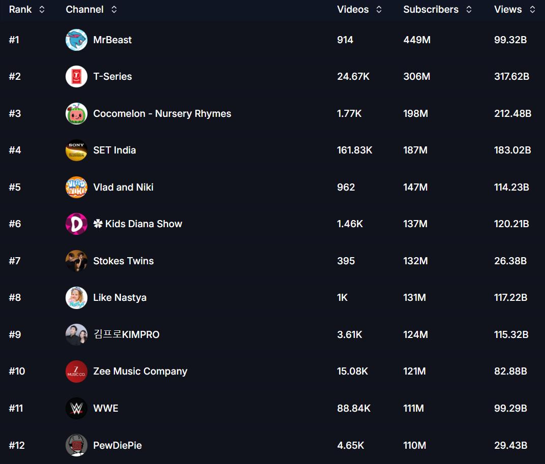 根據 vidiq 的統計,PewDiePie 目前是 YouTube 上排名第 12 的大播主。