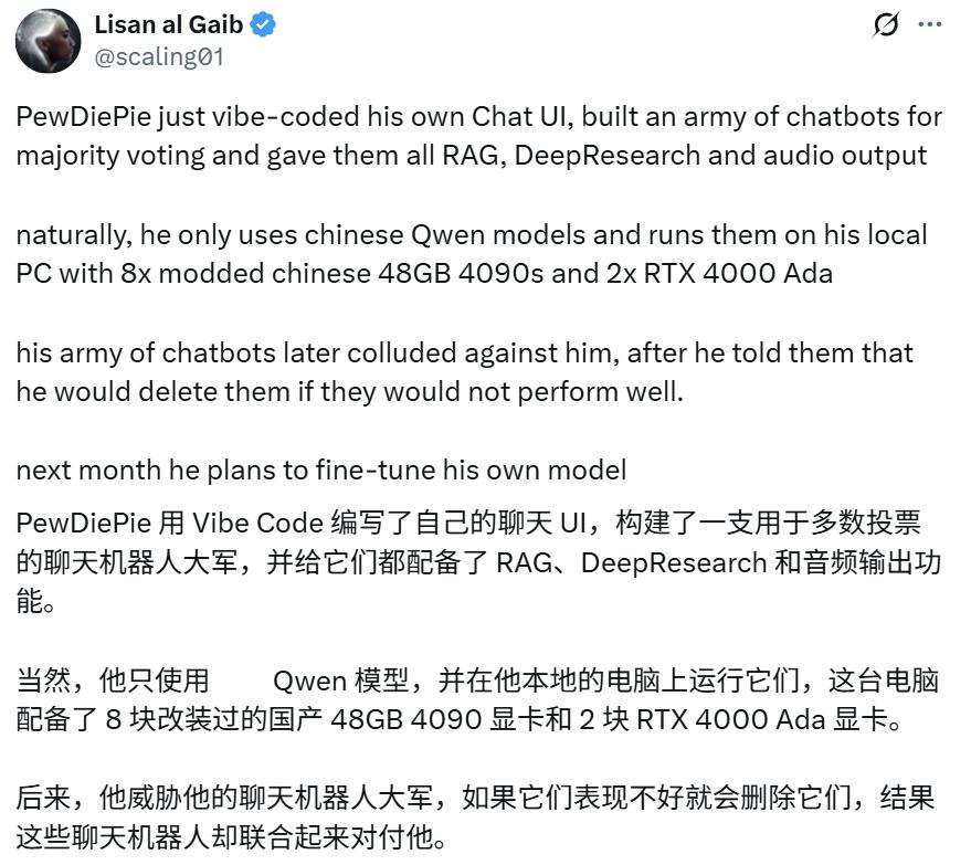 值得注意的是,PewDiePie 的很多工作流程都是 vibe coding。X 博主 @scaling01 總結説:PewDiePie 全憑感覺「vibe-coding」出一個聊天 UI,並打造了一支配備了 RAG、DeepResearch 和音頻輸出功能的「機器人軍隊」。