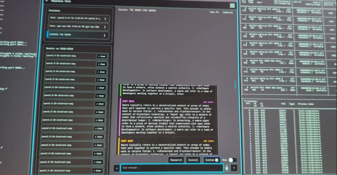 在最新的視頻中,PewDiePie 成功構建了一個定製的、自我託管的 AI 界面。該 UI 完全運行在他自己的 PC 上,由一個 10 GPU 配置驅動,並配備了一個能真正「投票」選出最佳回覆的聊天機器人團隊。