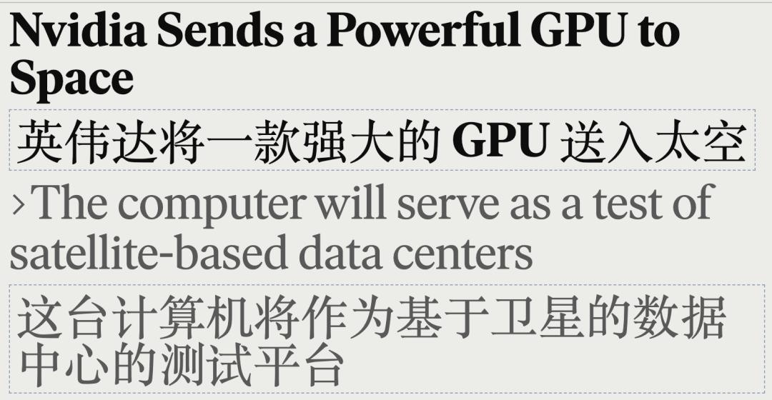 11月2日,星期日,英偉達首次將H100 GPU送入太空,以測試數據中心在軌道上的運行方式。