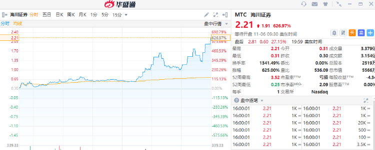 海川證券大幅上漲,收盤漲超620%。公司官網資料顯示,海川證券是2015年6月創立、2019年1月在納斯達克上市的資產管理集團,海川證券面向全球,以投資銀行、資產管理等業務為核心,在美國及中國香港持有證券經紀、資產管理和投資銀行牌照,海川接受美國SEC、FINRA及香港金融管理局等多地監管機構的監管。