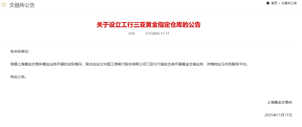 11月17日,上海黃金交易所發佈公告,根據上海黃金交易所黃金業務開展的實際情況,現決定設立中國工商銀行股份有限公司三亞分行指定倉庫開展黃金倉儲業務。