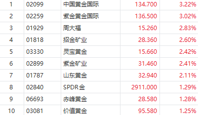 港股黃金股早盤反彈,截至發稿,中國黃金國際、紫金黃金國際漲超3%,招金礦業、山東黃金漲超2%。