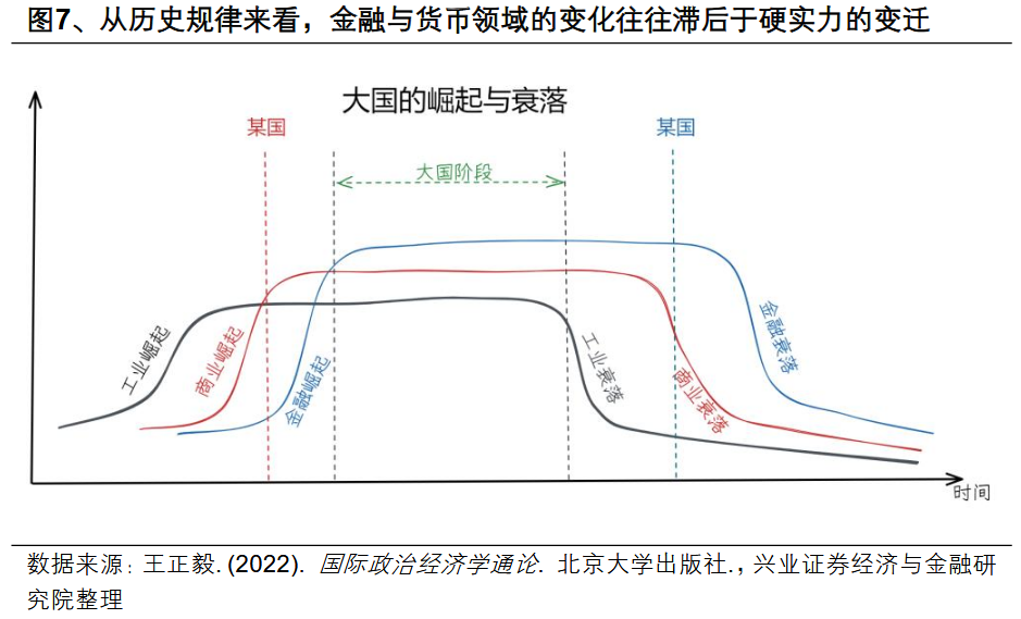 市場對於中美力量對比認知的重構,會逐步向貨幣傳導。特朗普2.0上臺一年以來的施政實踐,讓市場逐步認識到美國硬實力已今非昔比,這一變化已開始影響其對外軟實力。而相較於對美硬實力衰落的認知,全球對於美元的配置仍在高位。這符合歷史規律——國家興衰通常遵循「工業優勢→商業優勢→金融主導」的路徑,金融與貨幣領域的變化往往滯后於硬實力的變遷。換言之,當前中國硬實力的持續積累,理應逐步體現為金融與貨幣影響力的提升。加之特朗普「小院高牆」政策加劇了美元「易不到貨」的風險,這一進程有望進一步加速。