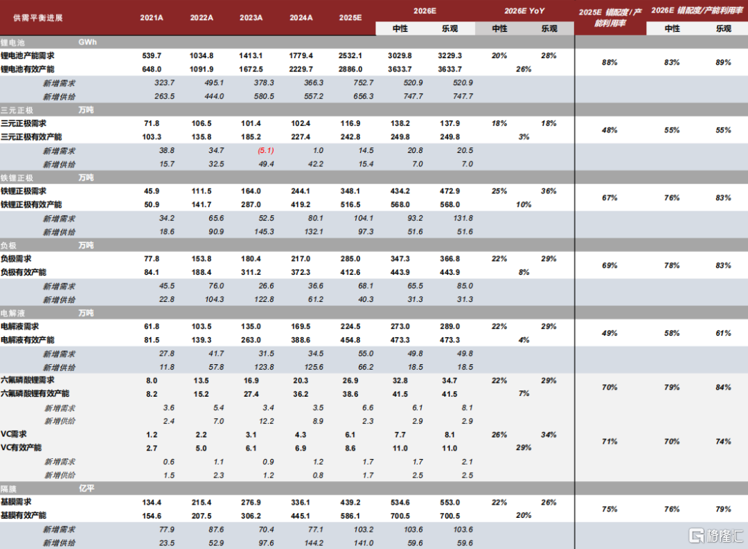 2024年以來產業鏈主動收縮產能擴張,疊加中小產能被迫減產或退出,供需關係得到改善;2025年,在儲能帶動需求端持續超預期下,產業鏈整體稼動率逐季回升,3Q25頭部廠商稼動率達到高位、部分處於超產狀態。展望2026年,我們預計頭部電池廠商資本開支仍有望保持高位、行業整體擴張與需求增長匹配,中性預期下我們預計2026年電池環節產能錯配度83%、同比略降,而樂觀預期下,我們預計產能錯配度89%、同比提升;此外考慮新增供給主要來自頭部廠商,我們預計電池的格局有望進一步向頭部廠商集中。材料環節整體擴張偏謹慎,其中鐵理正極、負極、電解液、6F環節2026年供給擴張同比不到10%,大幅低於需求端增長,在中性、樂觀預期下,行業產能利用率較2025年均有較大幅度提升、我們預計頭部廠商稼動率有望維持高位;隔膜、VC等環節行業供給擴張與需求增長匹配或者小幅低於需求增長,我們預計行業產能利用率亦有望呈現提升趨勢。
